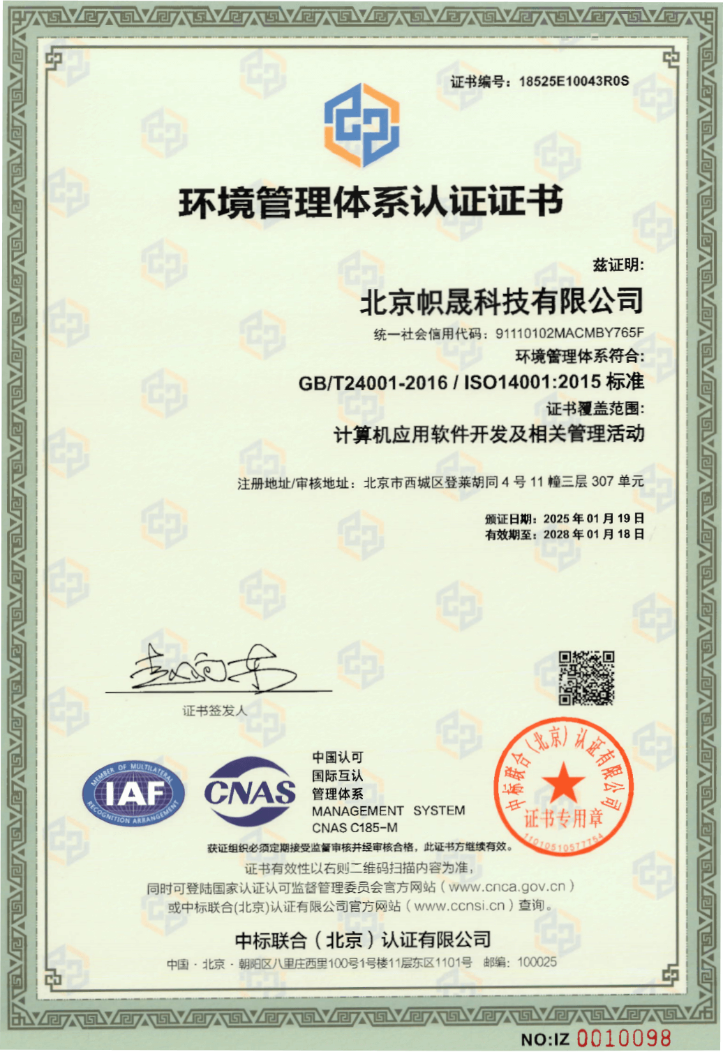 环境管理体系认证证书