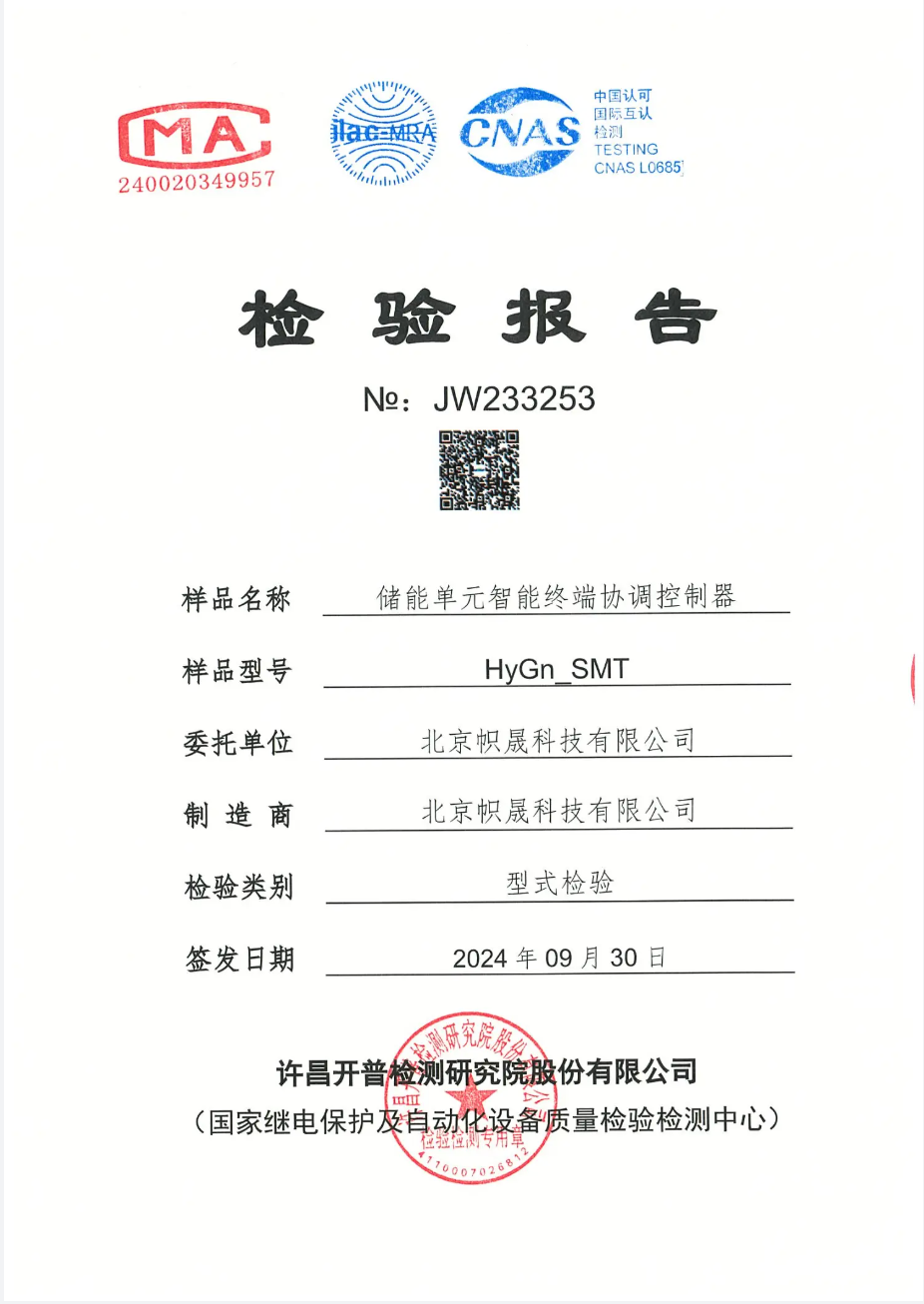 我们的储能协调控制器(SCU)产品已通过权威机构检测并获得证书