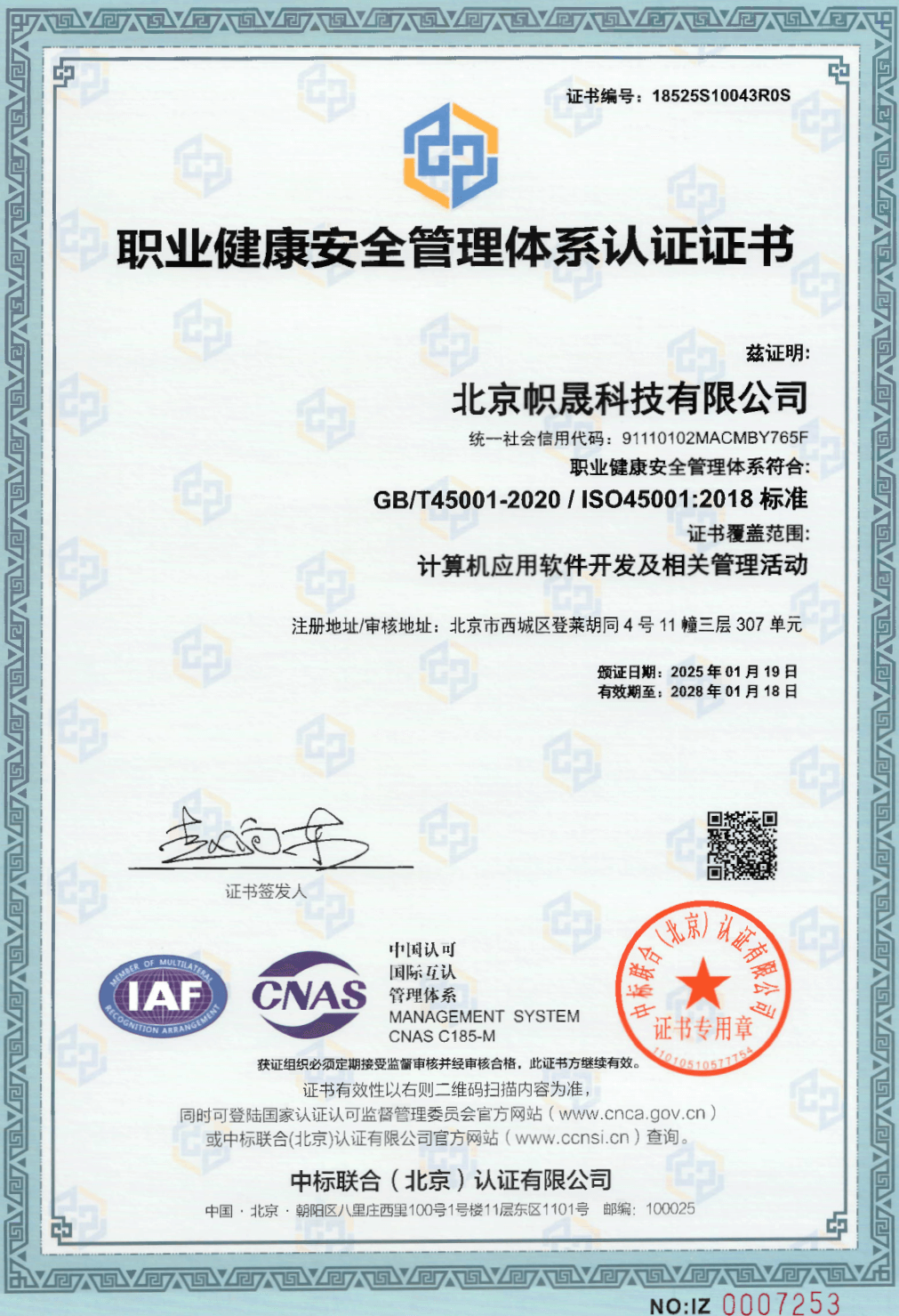 职业健康安全管理体系认证证书