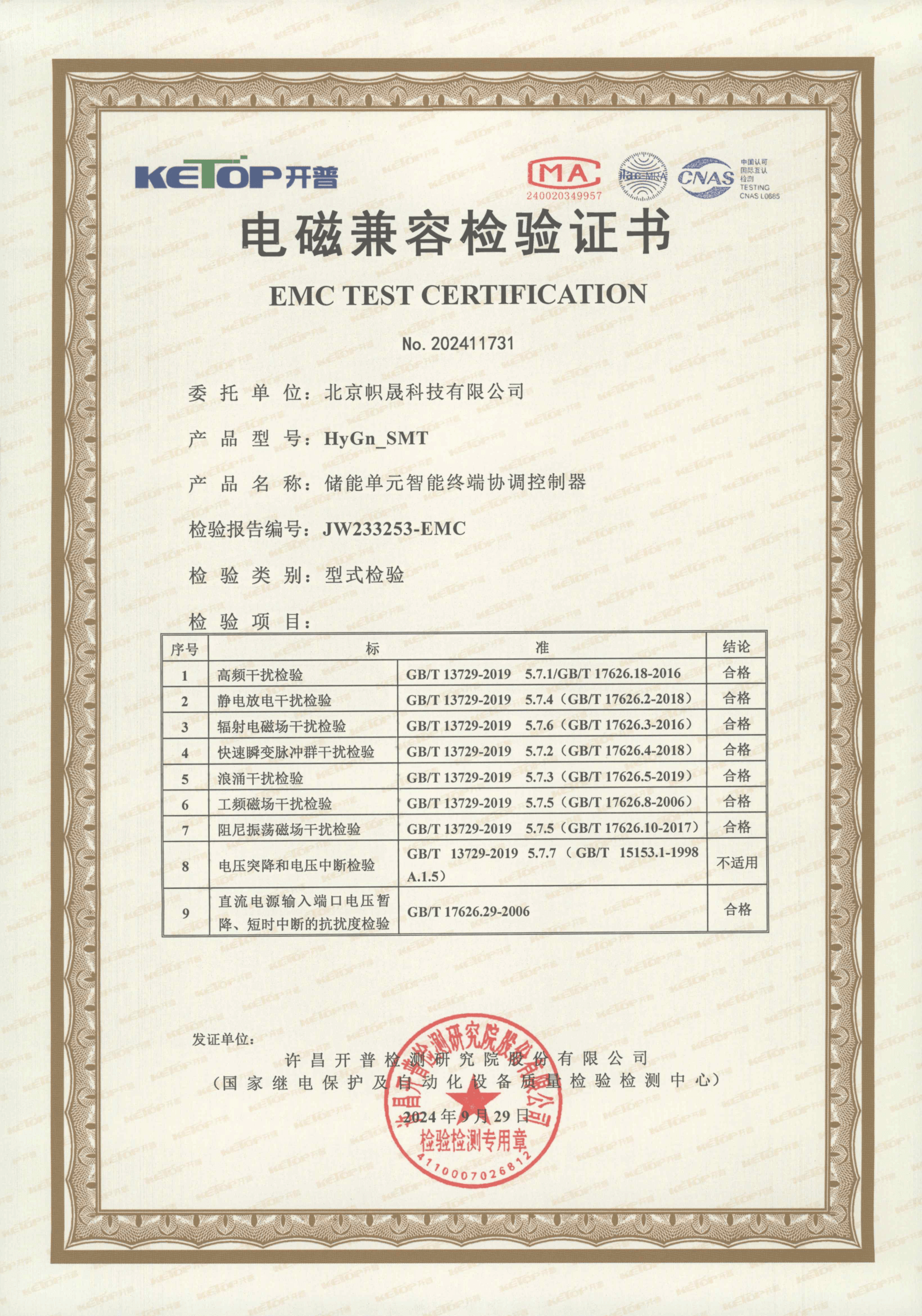 我们的储能协调控制器(SCU)产品已通过权威机构检测并获得证书